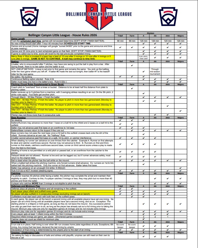 Bollinger Canyon Little League, a fully chartered and insured member of Little League USA, adopts local league-specific additions and modifications to the official Little League rules.